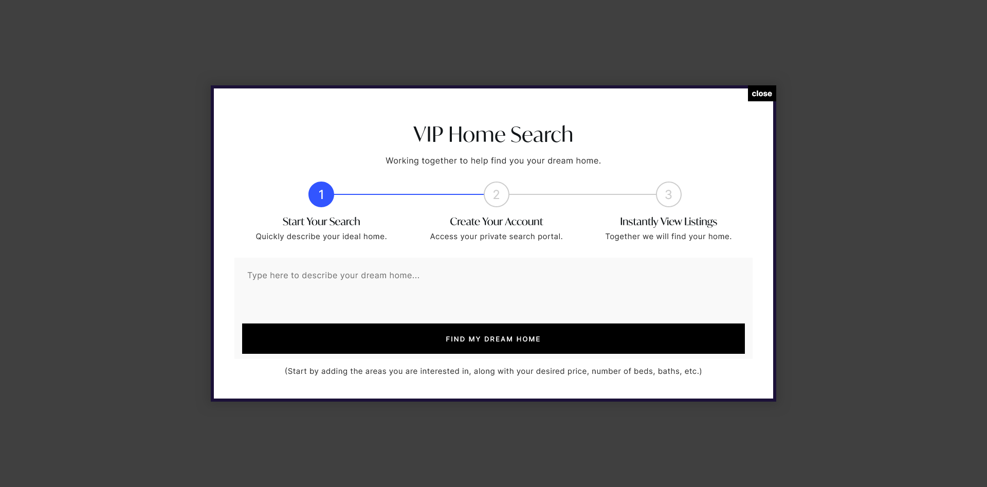 VIP Home Search Modal: Leverage our natural language search to capture buyer leads and instantly take them down a journey that feels more personalized.